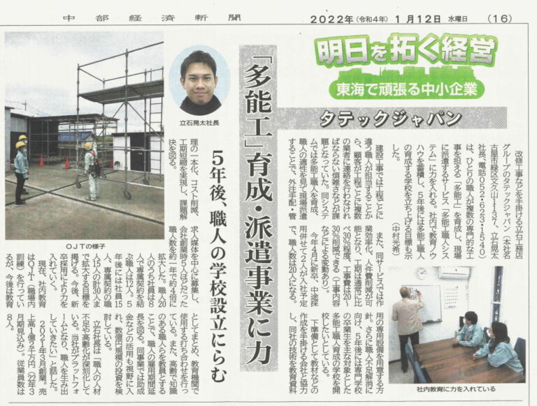 2022年1月12日(水曜日)版の中部経済新聞「明日を拓く経営ー東海で頑張る中小企業」にタテックジャパンが紹介されました。