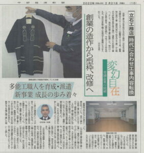 2022年2月21日(月曜日)版の中部経済新聞「老舗企業の挑戦ー変幻自在」に立石工務店が紹介されました。